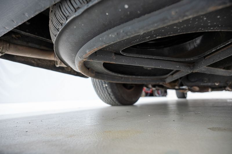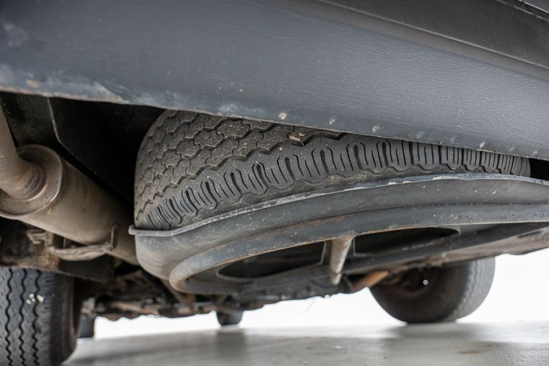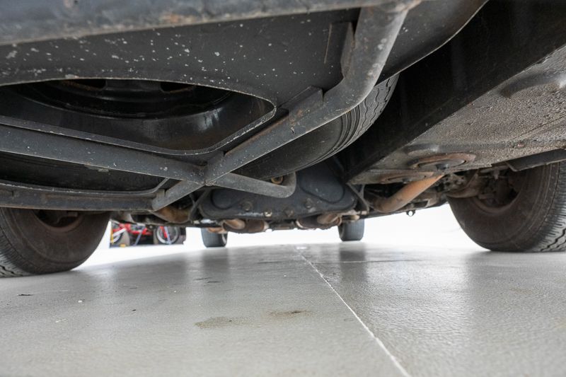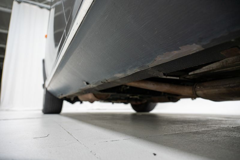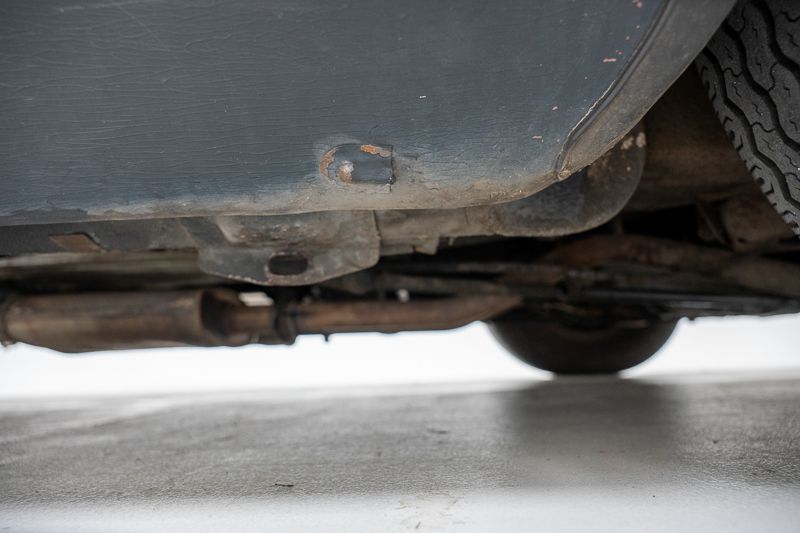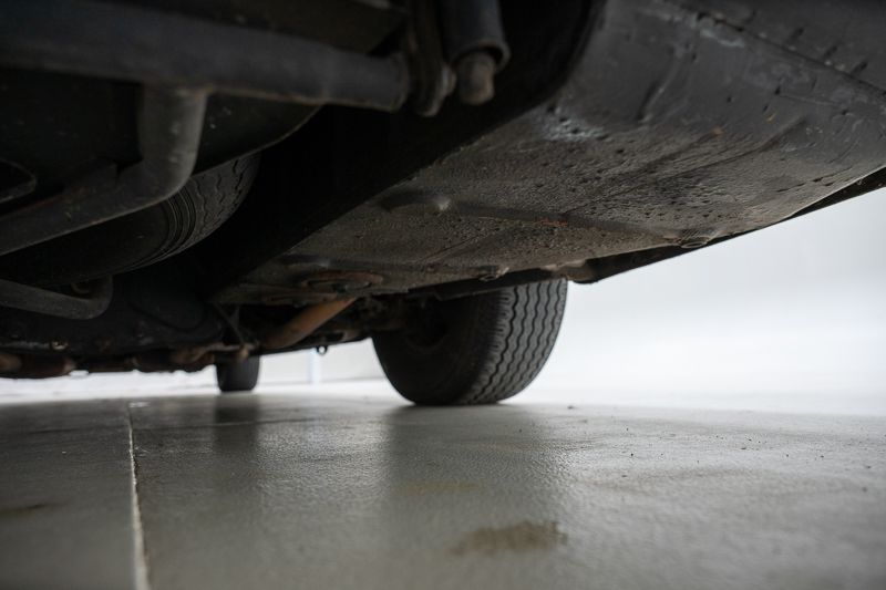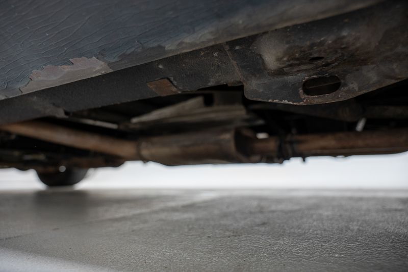 Le soubassement présente de la corrosion superficielle et plusieurs fuites d’huile ont été constatées, notamment au niveau du boîtier de direction et du radiateur de la boîte de vitesses. Les pneus sont desséchés et doivent être remplacés.